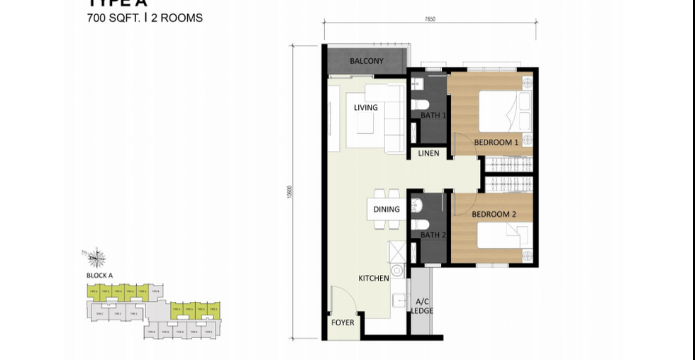 - 700sf (2 Rooms 2 Bathroom)